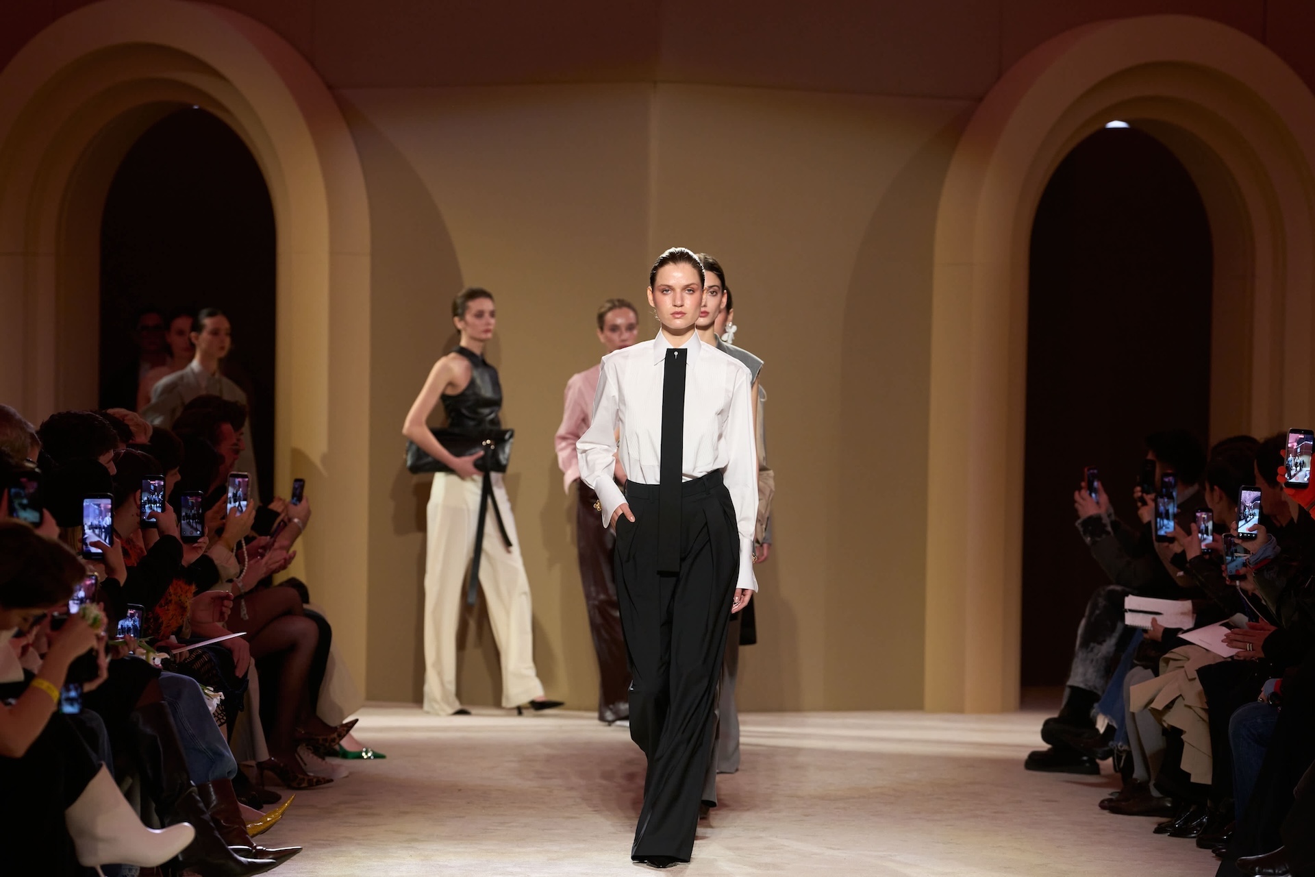 Un dialog intre forta si delicatete, unde siluetele sculpturale si materialele luxoase creeaza o feminitate controlata, reinterpretata contemporan.